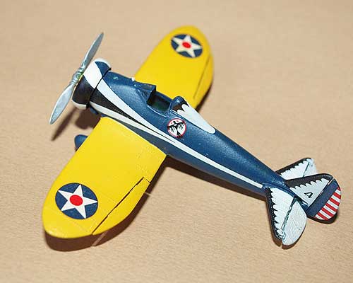 AHMから発売されていたボーイング P-26A ピーシューターは箱の表示が1/87になっていますが実際は1/100スケールです。第一次大戦と第二次大戦の間の期間の飛行機のシリーズの1つとして出ていました。COXから塗装済完成モデルと同じものです。1974の表示がありますので、37年前の発売だったのでしょうか?成形はグリーンで全面に小さいリベットを打ってありますが、いい感じです。操縦席はシートとフットペダルが一体の黒いパーツとして入っています。動翼は別パーツになっており、差し込み式で動くようになっていますが、このスケールではやり過ぎで、尾翼が厚くなってしまっています。エンジンの表現も非常によくできています。