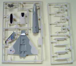 レベルから発売された1/100スケ−ルのユーロファイターは塗装済み、接着剤不要のお子様向きのキットです。脚はまっすぐな棒の先端に小さい円筒状の塊がついているだけで、マッチ棒みたいです。クリアパーツは無くキャノピーは塗装表現です。