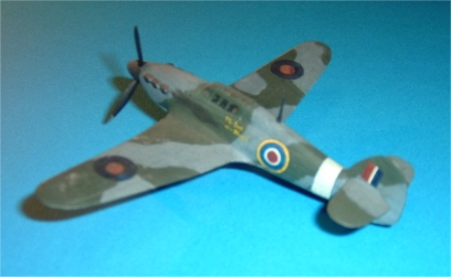 三和模型のハリケーンは形状はまずまずです。表面仕上げは問題があり、特に後部胴体の布張り部分にもリベットが打ってあります。虫ピンで止めるように指示されているスピンナーは大きすぎです。脚は短く、地上姿勢が変です。