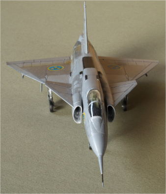 タミヤの1/100スケールのビゲンは、ミニジェットシリーズの中でもっとも完成するのが難しいキットではないでしょうか。ともかく部品の合いが悪いのです。複雑な形状からくる分割の難しさがたたって、非常に組みにくく、パテのお世話にならなければなりません。キットは試作機のモデルなので、量産型にするには、キットの修正以外に背中の脹らみの追加、主翼のドックソースの表現の追加をしなければなりません。